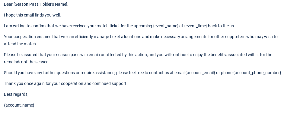 After you have freed up the seat for a season/subscription ticket, an automatic email will be sent to the ticket holder informing them that their season pass is no longer valid for this specific game.