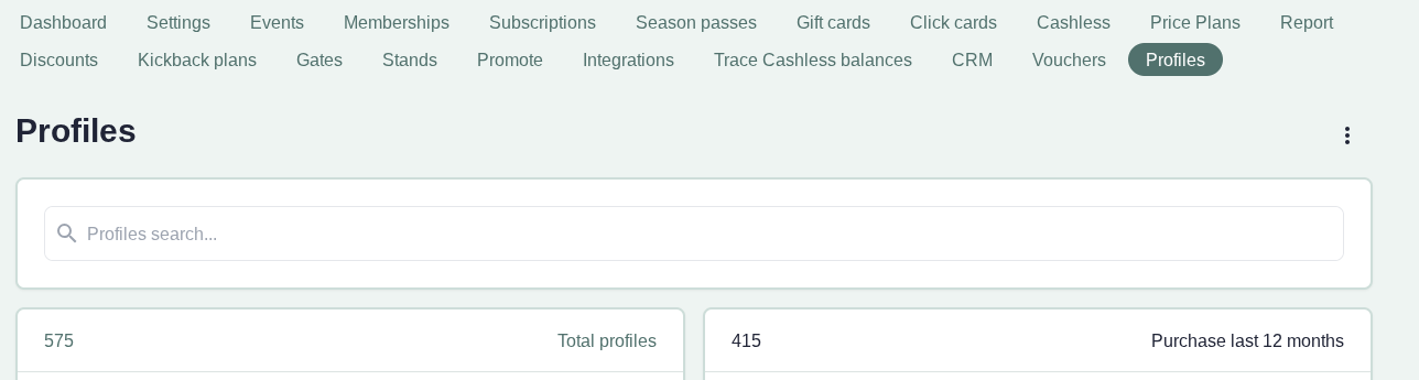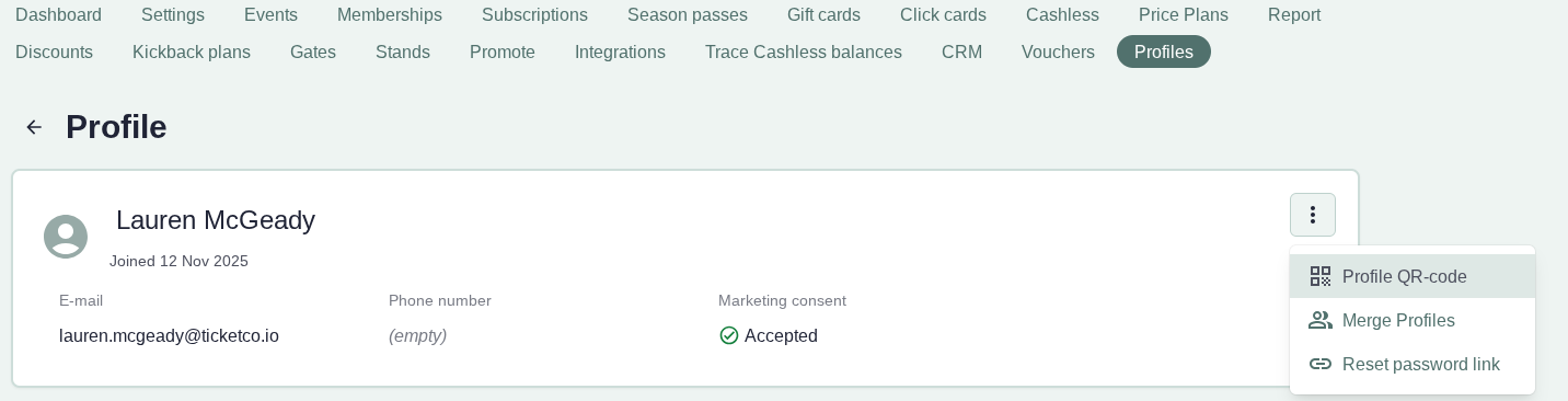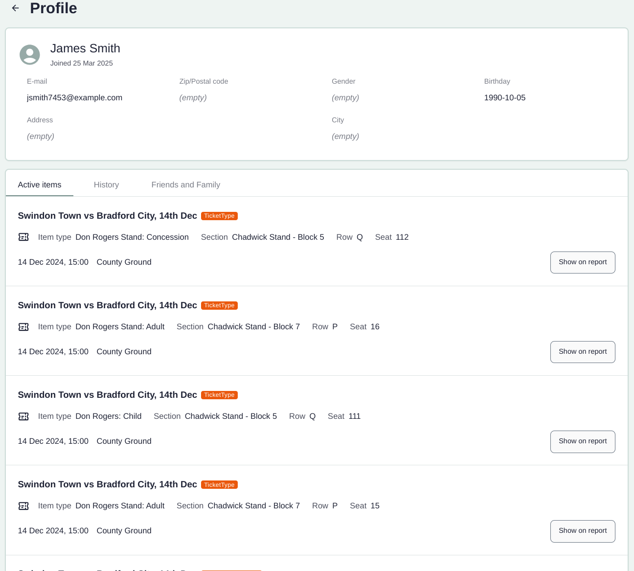 Here, he can view the QR-code for each ticket and also download them to his Apple Wallet. From an admin perspective, you will be able to view a list of purchases and data on the fan themselves under the Manage Profiles tab in the main menu. It may look something like this: