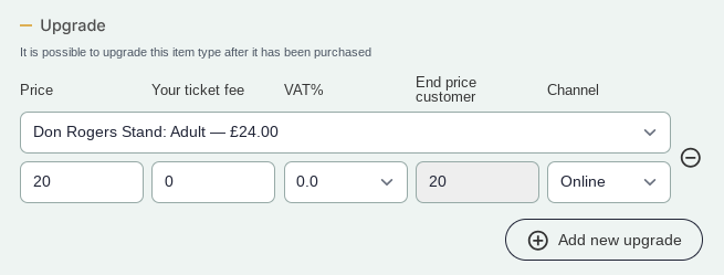 Note you can input the price of the upgrade, the fee and VAT % just as you normally would when pricing a ticket, and you can input multiple rows on the same ticket e.g. if you want to allow upgrades from a child ticket to a student ticket and also to an adult ticket.