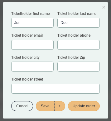 More often than not, the reason for missing tickets is that the customer entered an incorrect email address when they ordered. If you find the customer’s tickets in Report (by searching name or phone number), you can edit their mistyped email address and this will automatically resend their tickets to the correct address. Click on the settings symbol next to the tickets in Report, then click Edit and you will see a pop-up box like this one.