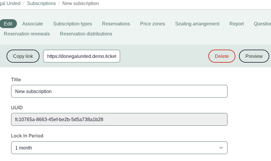 Setting up the subscription eventYou should already be familiar in how to create a season ticket (if you are not, please head this way), so setting up your subscription event and types should be straight forward. The same basic principals apply as when creating a season pass - you input first the general subscription details under Edit and then you set up your various prices under Subscription types. You will then associate a season pass to your subscription, but we will get back to that. Once the module has been activated for you, head to the Subscriptions tab in the main menu. |