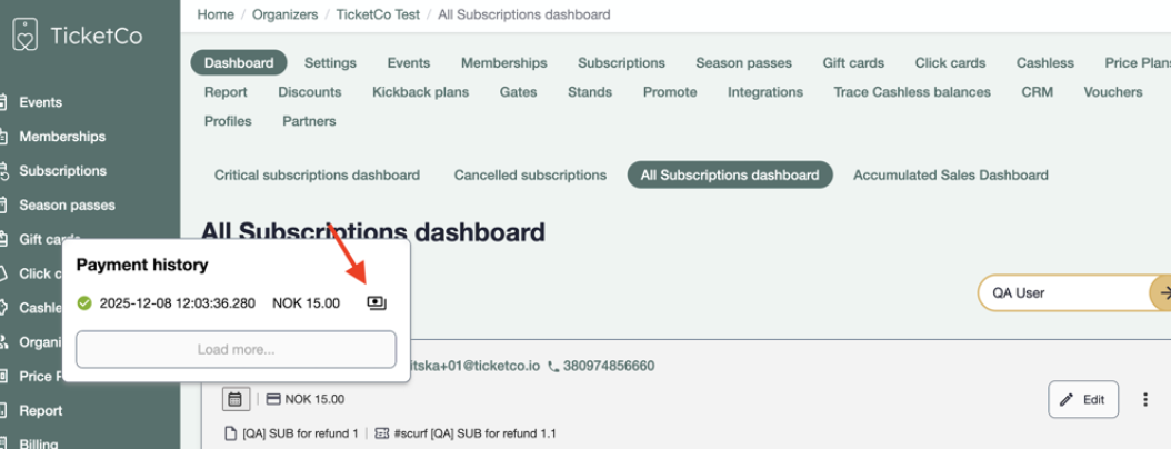 To refund a single subscription payment, open the subscription dashboard and locate the Pasubscription that you want to refund. Click the calendar icon .